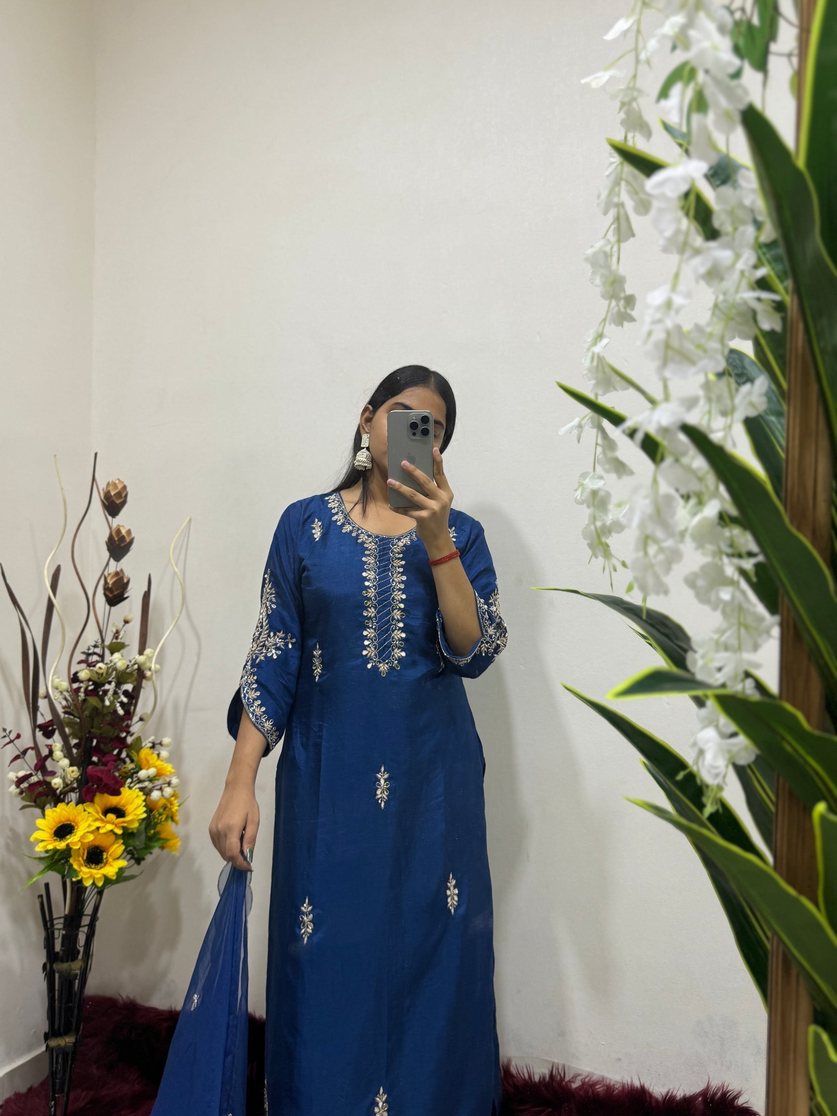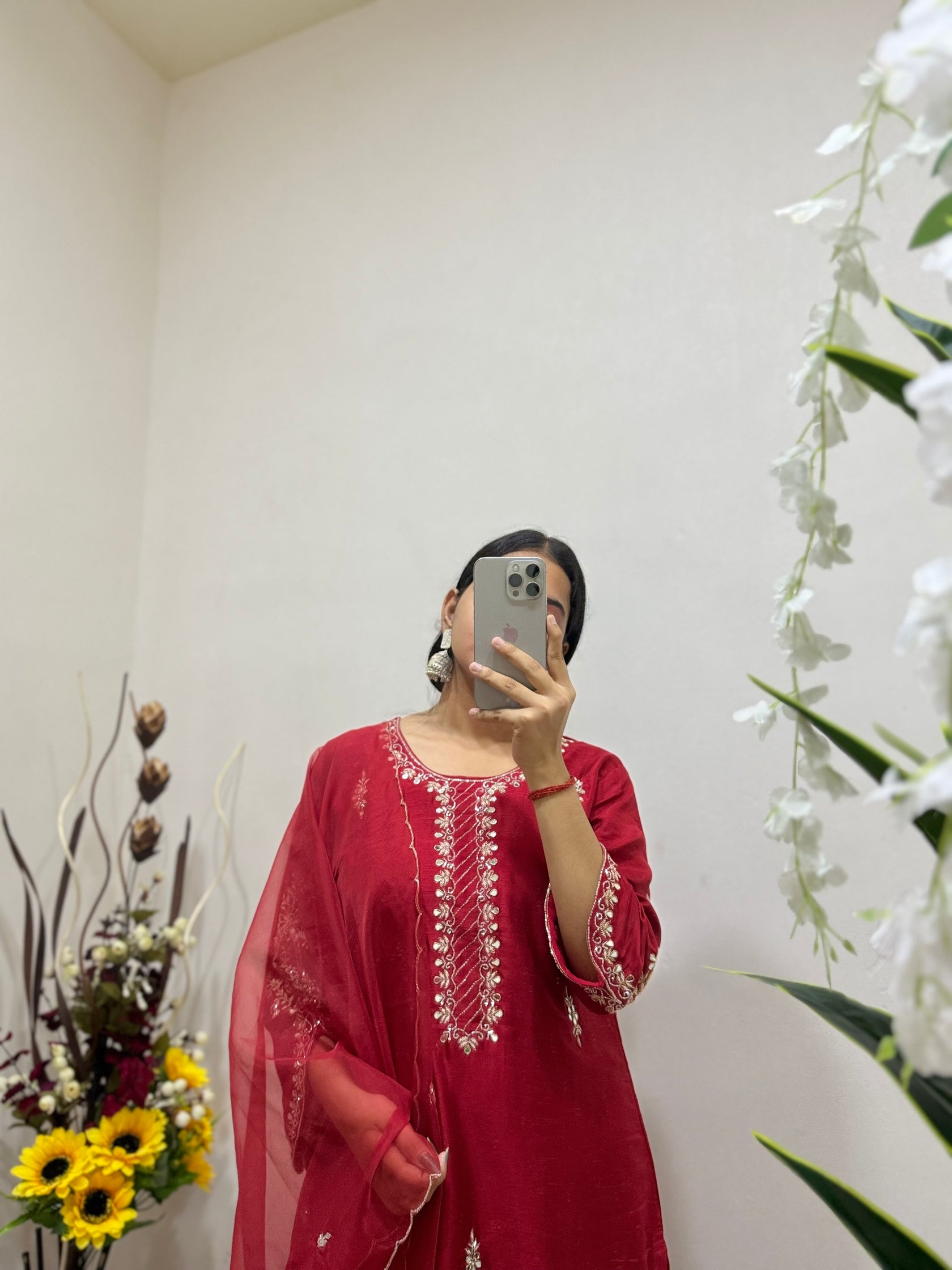 Our Red Embroidered Kurta Set with Dupatta will have you embracing vivid sophistication. The deep crimson color and elaborate embroidery on this outfit exude elegance. It's a versatile option for any event when paired with a coordinating dupatta, providing the ideal fusion of classic charm and modern flair for the style-conscious.