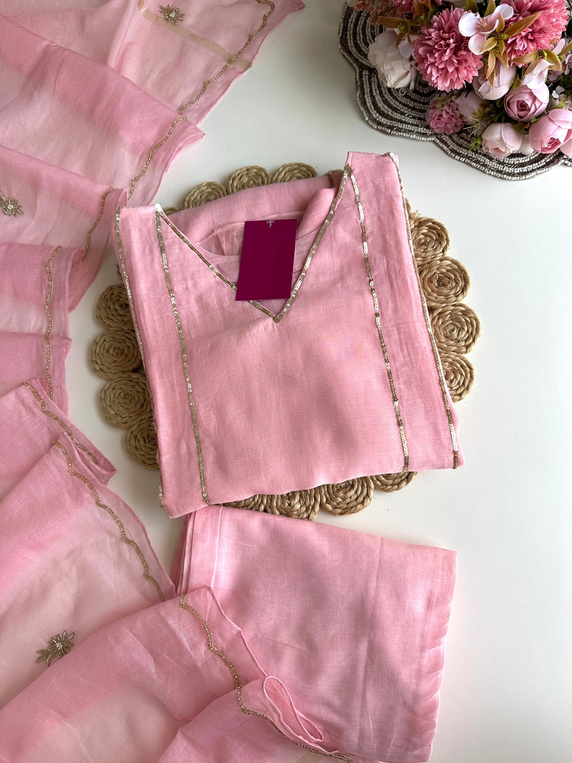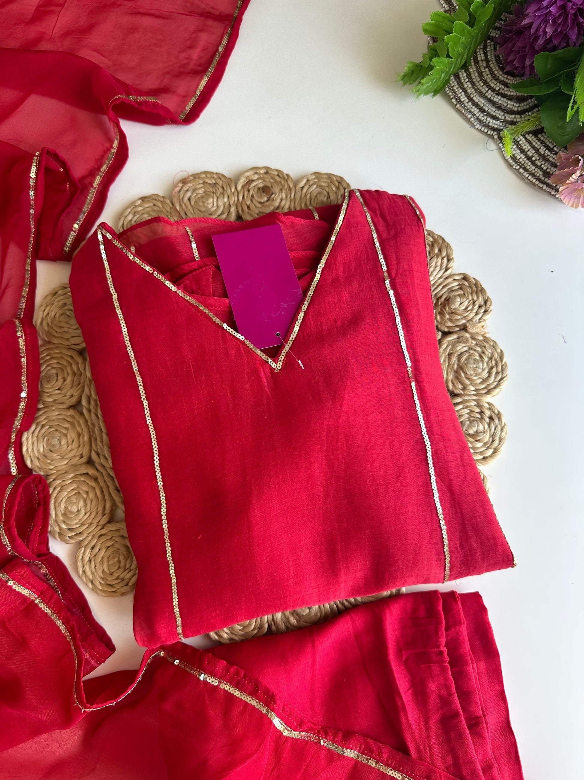 K070 - Mul Chanderi handwork Aline Kurti with pants and dupatta in