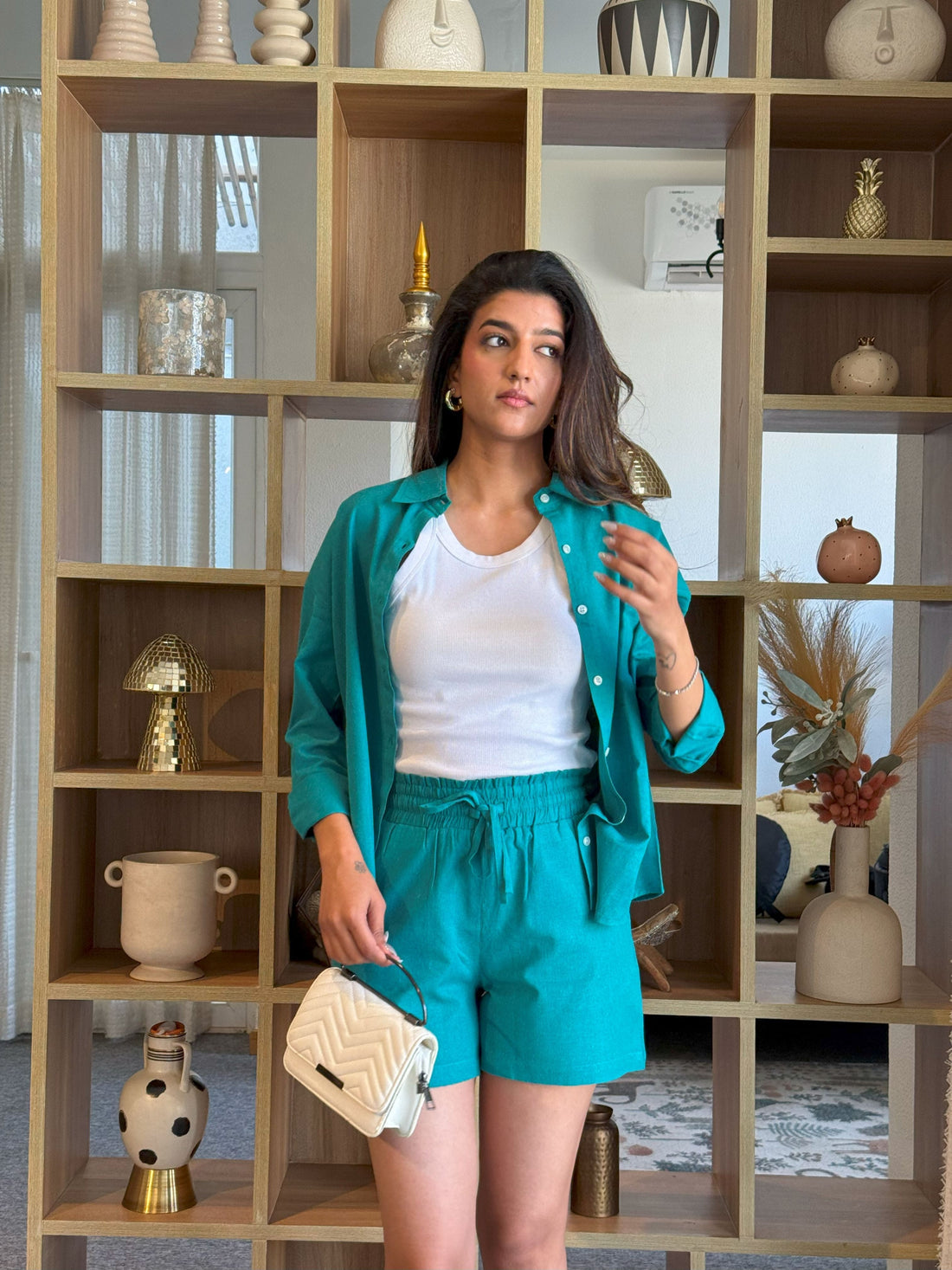 Teal - Oversized Linen-Cotton Shirt & Shorts Set